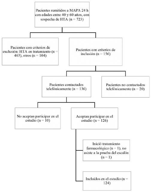 Se incluyeron personas de ambos sexos, con edades entre 40 y 60 años, de quienes se tenía sospecha de HTA por las cifras de PA en el consultorio o por la presencia de síntomas y que fueron remitidos para la realización de un MAPA 24 h. Se excluyeron aquellas personas que recibían medicamentos para tratar la HTA, con limitación mental, cognitiva o neurológica, quienes se encontraban en embarazo, tenían alguna contraindicación para realizar ejercicio, presentaban alguna alteración musculoesquelética que impidiera la realización de la prueba del escalón, con infecciones agudas y crónicas como VIH/SIDA, arritmias no controladas, enfermedad arterial periférica grave, enfermedad coronaria o cerebrovascular reciente, estenosis aórtica grave, insuficiencia cardiaca descompensada, embolia pulmonar y PA mayor de 200/110 mmHg.