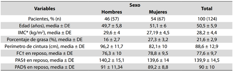 Entre los participantes, el 57,3 % (n = 71) tuvo una RHE (Tabla 2). Durante la prueba de esfuerzo submáximo en escalón se observó un incremento promedio de la FC de 38,3 ± 12,3 latidos/ minuto. Dicho incremento corresponde, en promedio, al 67,5 ± 8,4 % de la FC máxima teórica y al 41 ± 13,6 % de la FC de reserva (Tabla 2).