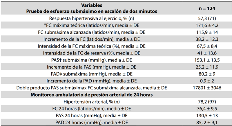 Se definió la presencia de HTA si el promedio de 24 horas de la PAS fue mayor a 130 mmHg y de la PAD fue mayor a 80 mmHg, y de igual modo si el promedio diurno de la PAS fue mayor de 135 mmHg y de la PAD fue mayor de 85 mmHg o si las cargas de presión fueron mayores al 30 % (porcentaje de las lecturas en que la PAS o PAD excedió los límites de 135/80 mmHg en tomas diurnas y 125/70 mmHg en tomas nocturnas) (32). El cardiólogo experto en HTA, encargado de hacer la interpretación del examen, desconocía el resultado de la prueba de esfuerzo submáximo en escalón.