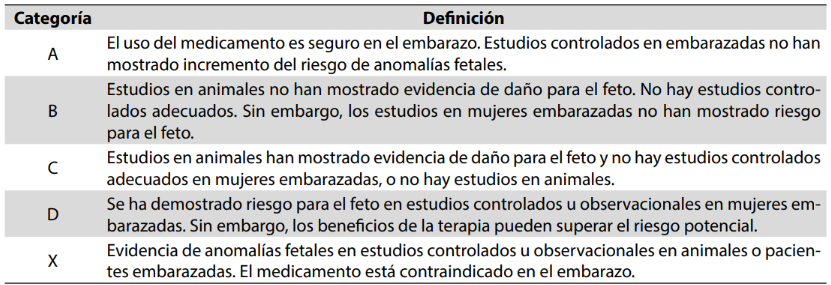 La FDA (Food and Drug Administration, por sus siglas en inglés) ha categorizado los riesgos de los medicamentos durante el embarazo en un sistema de cinco letras (8), que se puede ver en la Tabla 1.