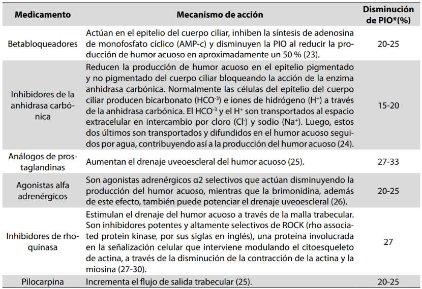 El glaucoma es una neuropatía óptica progresiva caracterizada por la degeneración de las células ganglionares de la retina, la cual produce un aumento característico de la excavación papilar (1). Se estima que en el mundo existen más de 60 millones de personas con glaucoma, de los cuales aproximadamente siete millones están en Latinoamérica (2). En Colombia se ha reportado una prevalencia del 5,6 % en mayores de 50 años (3). La presión intraocular (PIO) es el factor de riesgo más importante y hasta la fecha el único modificable (4). Todos los pacientes con glaucoma se benefician de una disminución de la PIO (5).