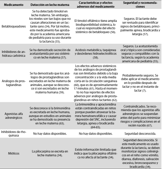 En la Tabla 4 se resume la detección en leche materna, características, efectos adversos, seguridad y recomendaciones acerca de los medicamentos para glaucoma en la lactancia (7,25,51-64).