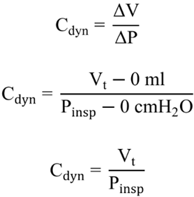 Por ello, resulta virtualmente imposible determinar la distensibilidad del SR en pacientes bajo VM, pues sería requisito indispensable conocer la magnitud del volumen dentro de los pulmones y la vía aérea, incluyendo el volumen residual, cuyas determinaciones requieren de pruebas de función respiratoria especializadas. Por otro lado, suponiendo un Vi = 0, el denominador de la operación sería 0, dando lugar a una paradoja matemática. Por ello, el concepto de compliancia (C) es más útil para la VM, ya que se refiere a un cambio de volumen con respecto a un cambio de presión: