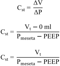 La Cst se calcula de la siguiente forma, al suponer Vi = 0 ml, presión final = Pmeseta y presión inicial = PEEP: