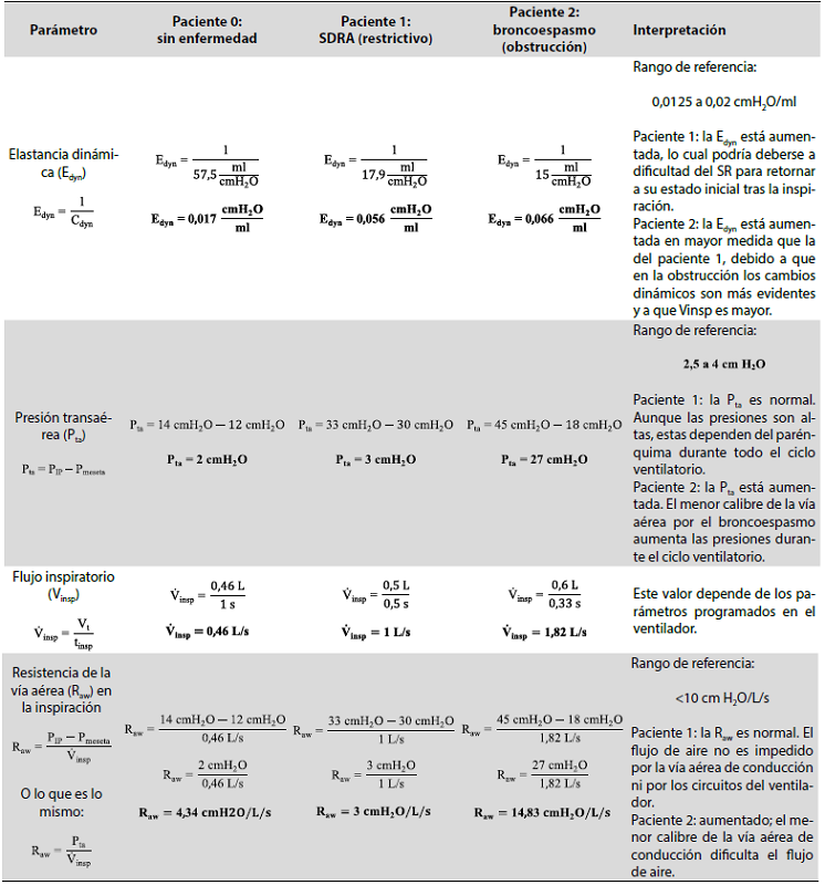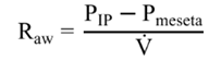 La Raw está compuesta por la resistencia de las vías aéreas del paciente, la cánula endotraqueal, los equipos de medición y circuitos de VM, el parénquima pulmonar y la caja torácica. Como se mencionó anteriormente, el componente resistivo no está presente en ausencia de flujo cuando se realiza la maniobra de pausa inspiratoria. Es por ello que la Raw inspiratoria se calcula a partir de la diferencia entre la presión máxima en la vía aérea y la presión meseta -lo cual se conoce como presión transaérea (Pta)- dividido entre el flujo inspiratorio. Los valores normales de la (Pta) en pacientes adultos van de 2,5 a 4 cmH2O. En caso de obstrucción al V, la PIP se incrementa, pero no la Pmeseta, por lo que la Pta aumenta. Para el cálculo de la Raw inspiratoria se utiliza la siguiente fórmula: