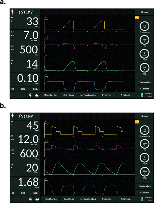 En el primer escenario de restricción tenemos a un paciente masculino que se encuentra bajo VMI, sedoanalgesia y bloqueo neuromuscular debido a SDRA -caracterizado por inflamación heterogénea de la membrana alveolocapilar, edema, disfunción del surfactante pulmonar, proliferación celular y fibrosis, que ocasionan una disminución marcada de la Crs -se encuentra con los parámetros ventilatorios que se muestran en la Figura 2a. La Pmeseta es de 30 cmH2O y el tinsp de 0,5 segundos. En la Tabla 1 (paciente 1) se muestran los cálculos e interpretaciones de los componentes necesarios para sustituirlos y realizar el cálculo de la EMSR.