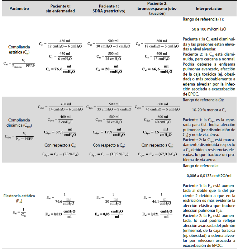 Similar a los conceptos de compliancia, la elastancia dinámica (Edyn) se determina cuando hay flujo de aire, mientras que la elastancia estática (Est) se mide durante una pausa inspiratoria. La Edyn y Est normales oscilan entre 0,0125 y 0,02 cmH2O/ml y 0,006 a 0,0133 cmH2O/ml, respectivamente. Sin embargo, los valores de Edyn aumentan a mayores flujos (20), algo que ocurre cuando aumenta la frecuencia respiratoria, cuando se reduce el tiempo inspiratorio o cuando aumenta el Vt. Por otro lado, el incremento en la PEEP se relaciona con una disminución de la E al evitar que el pulmón se contraiga completamente durante la fase espiratoria (21). En la Tabla 1, Paciente 0 se muestran los cálculos de Est y Edyn.