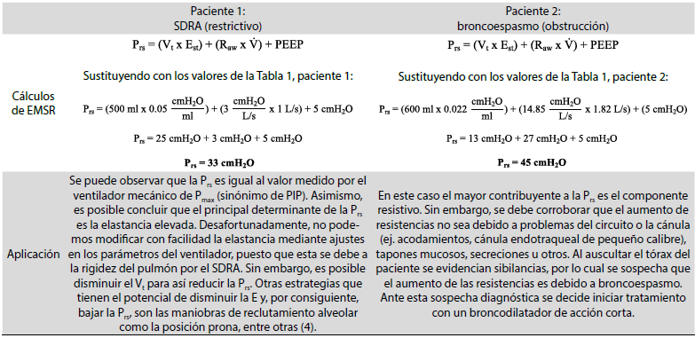 Como nota aclaratoria, aunque se considera que el modo controlado por presión es más adecuado para pacientes con enfermedad obstructiva al permitir un mejor control de la PSR, esto no significa que los modos controlados por volumen estén contraindicados (29). La Pmeseta en este caso es de 18 cmH2O y el tinsp de 0,33 segundos. En la Tabla 1, Paciente 2 se muestran los cálculos e interpretaciones de los componentes necesarios para sustituirlos en la EMSR, mientras que en la Tabla 2, Paciente 2 se muestran los cálculos y aplicaciones de la EMSR.