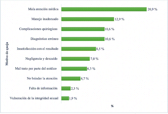 En el presente estudio el principal motivo de queja fue la mala atención médica, la literatura muestra cómo esta situación puede provocar insatisfacción del paciente, lo que conduce a presentación de quejas. En EE. UU., se evidenció que los principales motivos para presentar quejas fueron: menospreciar los pacientes, proferir insultos, murmurar amenazas, hablar con sarcasmo o insinuaciones, comportarse de mala manera, sabotear reuniones, incumplir la agenda, usar bebidas alcohólicas o drogas mientras se presta el servicio y sobrepasar límites sexuales (27). Entre tanto, otras investigaciones han relacionado la mala atención médica con motivos como la actitud del personal, el tiempo de espera y la negligencia (28-31). Källberg et al, encontraron que la mayoría de las reclamaciones en urgencias estaban relacionados con mala atención y tratamiento (48,8 %), procedimientos de diagnóstico (42,4 %) y mala atención en general (6,6 %) (32). Similar a lo registrado en México por Fajardo-Dolci et al, donde se indica que 73,6 % de los motivos de quejas están relacionados con el tratamiento, 20 % con el diagnóstico y sólo 1,9 % con la relación médico-paciente (33). En nuestro estudio, la mala atención estuvo relacionada con un servicio prestado de afán y falta de explicación al paciente, motivos relacionados con la mala comunicación. La evidencia coincide en que la mayoría de los motivos de queja están encabezados por dificultades o insatisfacción en lo referente a procedimientos de diagnóstico y tratamiento, que son condicionantes de la atención.