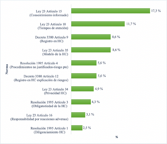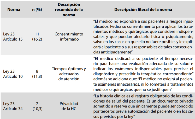 Si bien todas las intervenciones y procedimientos realizados durante la atención tienen como objetivo el beneficio del paciente, es una realidad que de ellos pueden derivarse daños. La práctica médica debe estar siempre regida por los principios éticos fundamentales para tener en cuenta: beneficencia, no maleficencia, autonomía y justicia. Las principales fallas en cuanto a ética médica que fueron encontradas en nuestro estudio fueron la no solicitud de consentimiento informado y los tiempos inadecuados para la atención. Raeissi P et al, encontraron que las principales fallas fueron la falta de habilidad para la evaluación clínica (30,4 %), negligencia (29,2 %), imprudencia o indiscreción (26,3 %) y el incumplimiento de los requisitos gubernamentales (14,1 %) (44).