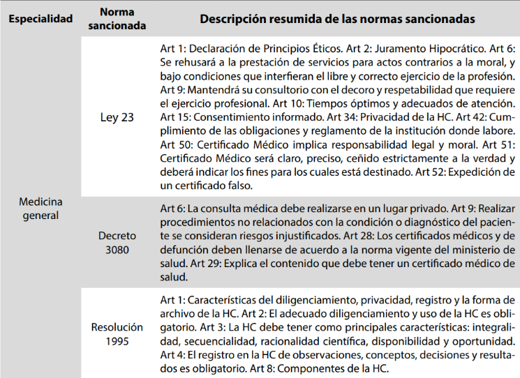 De 679 médicos involucrados en 461 quejas analizadas, a 5,7 % (39/679) les fenecieron sus procesos, a 32,2 % (219/679) les dictaminaron preclusión y a 58,6 % (398/679) se les archivaron, dado que posterior a la revisión no se encontró fundamento en el motivo de queja. El resto de los médicos involucrados recibieron sanción: 3,4 % (23/679). Entre estos, a 60,8 % (14/23) se les suspendió el ejercicio de la medicina, a siete por 6 meses y al resto por 5 meses o menos tiempo, 17,4 % (4/23) tuvieron censura pública, 13 % (3/23) amonestación privada y 8,7 % (2/23) censura escrita privada o censura verbal pública. Ocho de los sancionados fueron médicos generales (34,8 %), cinco (21,7 %) cirujanos plásticos y el resto de especialidades fueron gerencia en salud, medicina estética, ortopedia, otorrinolaringología y urología. En la Tabla 2 se evidencia que la mayoría de las normas sancionadas estuvieron relacionadas con un manejo y registro inadecuado de la historia clínica. Las principales sanciones fueron por la no explicación o mal diligenciamiento del consentimiento informado en 16,2 % (11/679) y el no respeto a los tiempos óptimos y adecuados de atención en 11,8 % (8/679). Finalmente, en la Tabla 3 se detallan las normas sancionadas según especialidad.