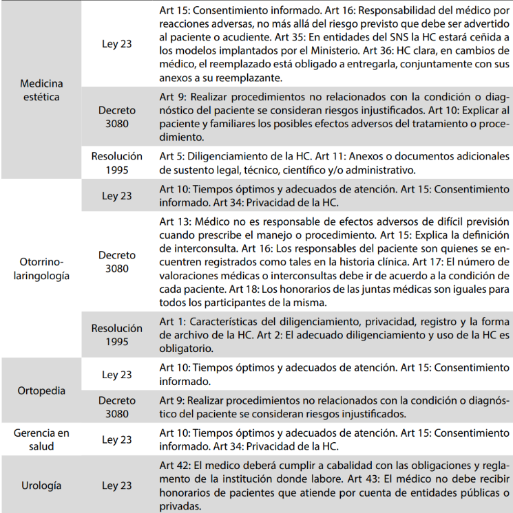 Otras especialidades del médico implicado fueron medicina laboral y salud ocupacional 3,5 % (24/679), especialidades administrativas 3,2 % (22/679), subespecialidades de cirugía y neurocirugía 3,1 % (21/679), urología 2,9 % (20/679), medicina interna 2,8 % (19/679), psiquiatría 2,8 % (19/679), anestesiología 1,8 % (12/679), pediatría 1,5 % (10/679), y oftalmología y subespecialidades 1,0 % (7/679). En cuanto a quien presentó la queja ante el TEMA, se encontró que en la mayoría de los casos fue el paciente 50,8 % (234/461), seguido de algún familiar 38,2 % (176/461). Otros quejosos fueron amigos, algún profesional de la salud, la IPS, abogados, jueces, policía, Supersalud, secretario municipal, procuraduría, o algún magistrado del TEMA.