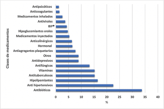Tras el ingreso (primeros 3 meses) al programa a 16 (3,2 %) pacientes que tuvieron un promedio de 640 células CD4/mL no se le prescribió tratamiento antirretroviral, quienes. Entre quienes recibieron antirretrovirales, los esquemas más frecuentemente formulados fueron aquellos basados en inhibidores de la transcriptasa reversa no nucleósidos (ITRNN) (76,1 %, n=375), basados en inhibidores de proteasa (IP) (16 %, n=79), y basados en inhibidores de integrasa (4,7 %, n=23). Al 70,8 % (n=349) de los pacientes se les prescribió al menos un medicamento adicional diferente a los antirretrovirales, siendo los antibióticos (34 %, n=118), antihipertensivos (22 %, n=77), e hipolipemiantes (16 %, n=56) los más frecuentes (Figura 1).