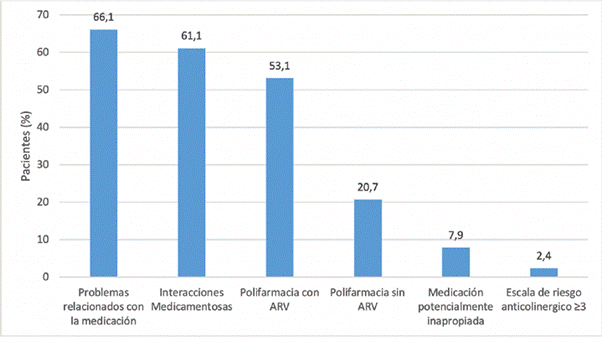 Resultados: se analizaron 493 pacientes. 62,7 % (n=309) de pacientes se encontraban en estadio 3 de la OMS y 49,5 % (n=244) tenían alguna condición definitoria de SIDA, siendo las más frecuente el síndrome de desgaste 23,7 % (n=117) y la tuberculosis 16,8 % (n=82). Al momento del diagnóstico, la mediana de CD4 fue 176 células/mL (RIQ 59-352) y carga viral 117.323 copias/mL (RIQ, 28.237411.139). Un 59 % (n=291) tenían comorbilidades no infecciosas, las más comunes hipertensión arterial 22,3 % (n=110) y dislipidemia 14,2 % (n=70). Se encontraron 66,1 % (n=326) pacientes con problemas relacionados con la medicación, siendo los más frecuentes: interacciones medicamentosas 61,1 % (301), polifarmacia con ARV 53,1 % (262), medicación potencialmente inapropiada 7,9 % (39), y alto riesgo anticolinérgico en el 2,4 % (12).