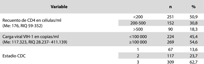 Ingresaron entre 2013 y 2016 un total de 569 pacientes. Se excluyeron 76 (13,3 %) pacientes, quedando 493 pacientes adultos con 50 o más años para ser analizados al momento del diagnóstico de VIH. Esta población analizada muestra una mediana de edad de 55 años (RIQ 52-59), el 77,5 % (n=382) pertenecen al género masculino, y de estos, el 46,7 % (n=178) practica el sexo con hombres. La mayoría de los pacientes tuvo un recuento inicial de CD4 menores de 200 células/mL, estadio 3 de la enfermedad, y cargas virales mayores a 100.000 copias/mL (Tabla 1).