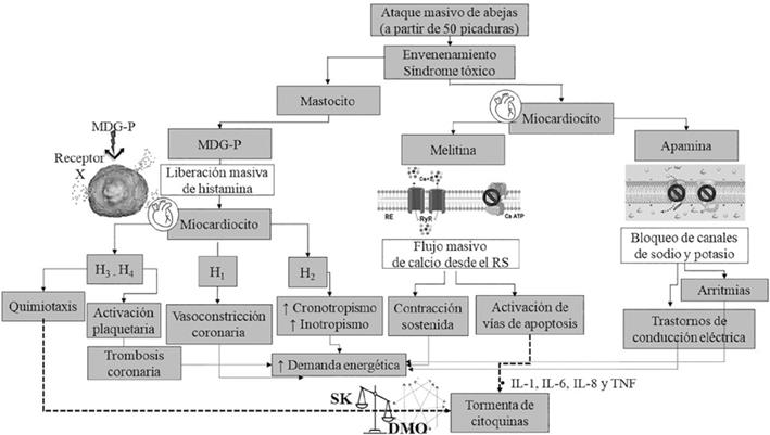 En cuanto al objetivo de esta revisión, consideramos que el efecto toxicodinámico de la apitoxina representa el patrón de daño inicial que da pie a la instauración de la tormenta de citoquinas como vía común. El diagnóstico de SK por envenenamiento apídico siempre será eminentemente clínico, y se basa en el antecedente de exposición y un evento coronario agudo que coinciden en el tiempo. Al no contar con un antídoto específico para este tipo de intoxicación, el tratamiento oportuno e individualizado limitará la progresión del toxidrome y, por ende, el compromiso multisistémico que finalmente puede llevar a la muerte.
