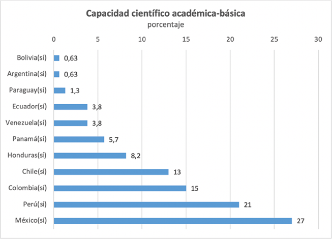 En la Figura 1 se observa que los países con mayor frecuencia de capacidad científica-académica básica fueron México (27,2 %), Perú (20,9 %) y Colombia (14,6 %).