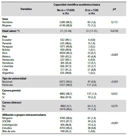 Results: Of 11.587 students, only 1.4% had basic scientific-academic capacity. The factors associated in a positive way were being from private universities (PR: 4.85, p < 0.001), affiliation to a student scientific society (PR: 3.20, p < 0.001), research groups (PR: 2.97, p < 0.001) and more than one extracurricular group (PR: 4.29, p = 0.012). The factors associated negatively were being from Bolivia (PR:0.05, p = 0.005), Argentina (PR: 0.06, p = 0.011) and Peru (PR: 0.14, p < 0.001).
