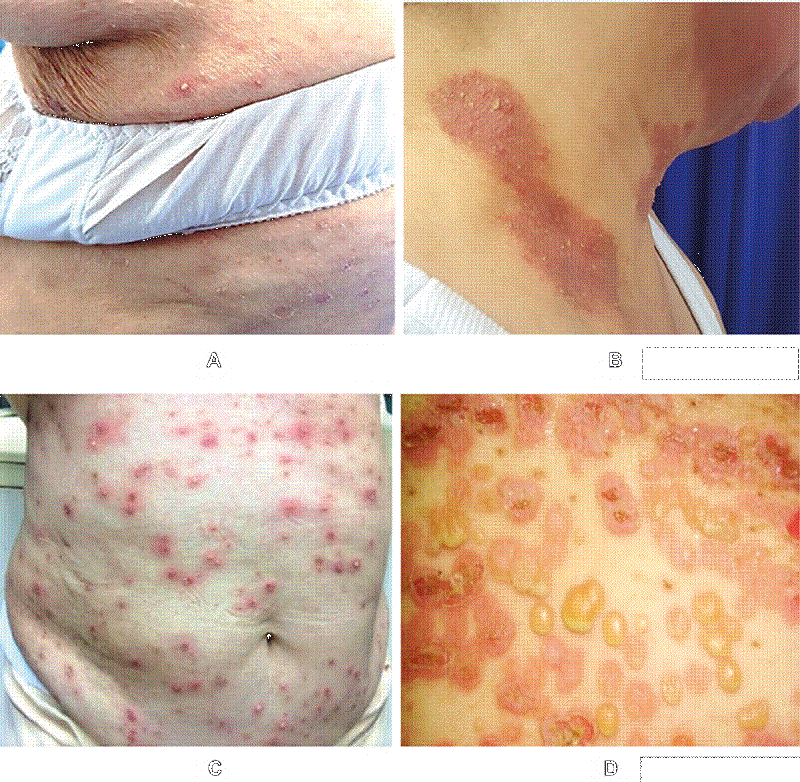 Se presenta una serie de casos de seis mujeres con DPS, con edades entre 45 y 82 años (Tabla 1), diagnosticadas en un centro dermatológico de referencia nacional entre el 2010 y el 2021. Las pacientes presentaban lesiones de larga evolución, en promedio de cinco años, con predominio de pústulas, pápulas y placas eritematocostrosas con bordes circinados, además de vesículas, ampollas, erosiones y costras (Figura 1). Las zonas más afectadas fueron el tórax, las áreas intertriginosas y el tercio proximal de las extremidades.