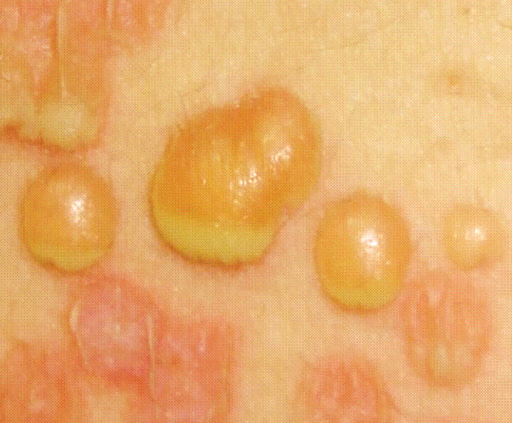 En dos casos se observaron las pústulas flácidas características de DPS, con material purulento en su base y contenido seroso en la parte superior (Figura 2). Todas las pacientes presentaron prurito, con excepción del caso número seis.