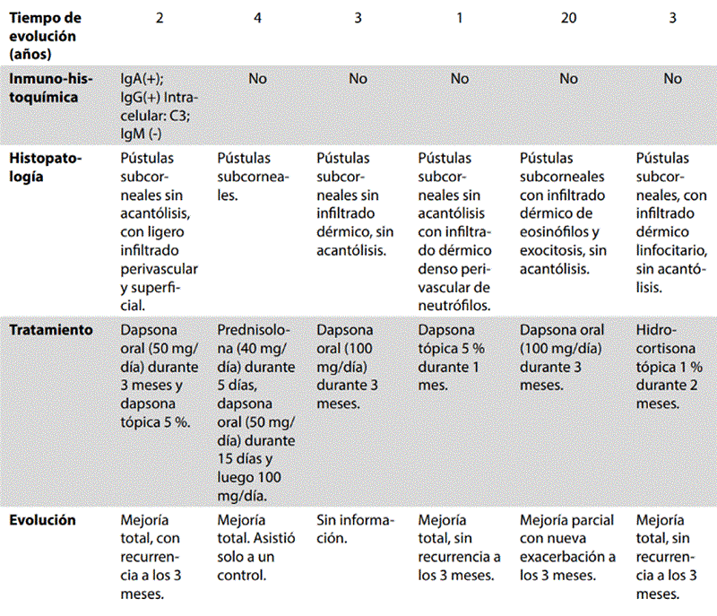 Todos los casos cumplieron los criterios clínicos descritos en la literatura (Tablas 2 y 3) y se analizó la correlación con los hallazgos identificados en la histopatología: acumulación subcorneal de neutrófilos en ausencia de espongiosis y acantólisis (Figura 3). Se realizó inmunofluorescencia directa (IFD) solo en el primer caso, con presencia de anticuerpos IgA e IgG positivos a nivel intercelular, C3 e IgM negativos (Tabla 1).