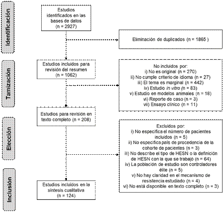 Los artículos identificados fueron tamizados con la lectura del resumen y la aplicación de los siguientes criterios de inclusión: i) que estuvieran escritos en inglés, español o portugués, ii) que fueran artículos originales, iii) que el tópico central fuera la resistencia natural al VIH-1, iv) que fueran realizados en humanos (no se incluyen estudios in vitro o en modelos animales) y v) que fueran investigaciones diferentes a ensayos clínicos o reportes de caso.
