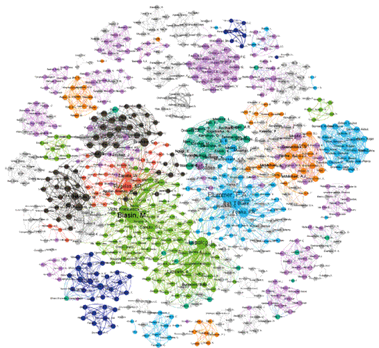 La comunidad científica en relación con el estudio de la resistencia natural al VIH-1 estuvo conformada por 688 investigadores de países como Estados Unidos, Italia, Canadá, España, Brasil y Colombia, entre otros. La red de autores presentó una modularidad de 0,896 (1,0 es el máximo posible), lo que indica la presencia de abundantes grupos que están colaborando para producir nuevo conocimiento científico en el tema (Figura 2).