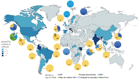 Los 124 artículos incluyeron 141 poblaciones de 24 países diferentes y 9 estudios multicéntricos que en total suman 4079 personas HESN. En Italia (n = 28), Kenia (n = 21), Colombia (n = 15) e India (n = 11) se concentra el 53,3% de las poblaciones estudiadas. En los estudios hubo diferentes tipos de HESN con predominio de parejas serodiscordantes (64,5%), seguido de trabajadoras sexuales (17,7%) y UDI (9,2%). Otras poblaciones incluidas en menor proporción fueron HSH (4,3%), hijos de madres VIH-1 positivo (3,5%) y hemofílicos (0,7%) que recibieron transfusiones entre los años 1979 y 1984 (Figura 3).