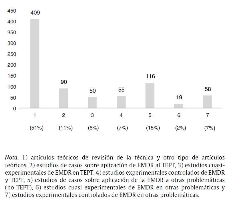 La figura 2 muestra que los artículos teóricos conforman el 51% de las publicaciones. Los estudios de casos en general, tanto los de TEPT como los publicados aplicando la EMDR a otras problemáticas, suponen el 25% de las publicaciones. Los estudios cuasi experimentales conforman el 8% del total de los artículos publicados. Finalmente, el 14% de los estudios publicados se refieren a estudios experimentales controlados.