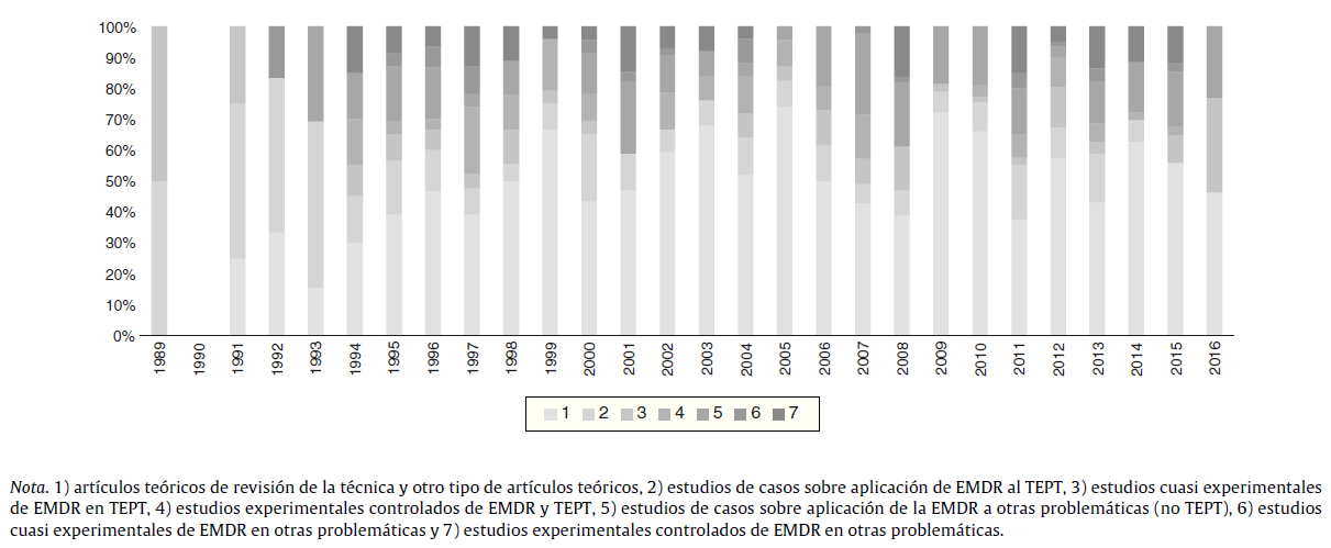 Aunque la EMDR surge como tratamiento del TEPT, desde los primeros momentos suscitó interés en otras problemáticas. De forma más específica, un total de 197 son estudios empíricos sobre EMDR en TEPT (incluye las categorías 2, 3 y 4) y un 193 son estudios empíricos sobre EMDR en otras problemáticas (incluye las categorías 5, 6 y 7). La figura 3 revela que inicialmente predominan los artículos teóricos y los estudios de caso y que progresivamente van apareciendo otro tipo de estudios. En 1994 se publican los primeros estudios experimentales controlados sobre la técnica, tanto en TEPT como en otras problemáticas. También puede verse en la figura que hay más estudios experimentales en otras problemáticas que específicamente en TEPT, si bien es verdad que otras problemáticas está conformado al menos por diez trastornos diferentes.