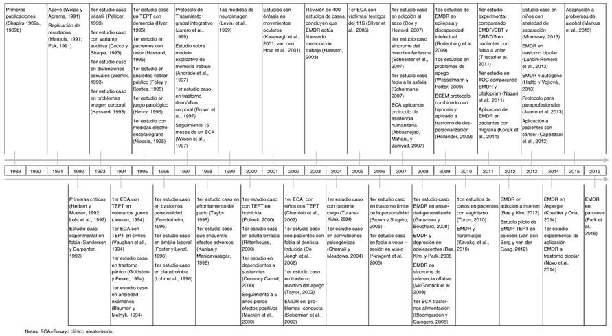 Abstract: Eye movement desensitization and reprocessing (EMDR) has led to a great number of studies since its appearance in 1989. The aim of this article is to describe EMDR development and evolution to the present day. With this purpose a search was carried out on MEDLINE and PsycINFO with the entry “eye movement desensitization”. After revising the resulting 797 articles, those that because of their relevance explained best the development and evolution of the technique were chosen and shaped into a lifeline graphically representing the history of EMDR. Despite the fact that during the first years the focus of research was on the validation of the technique for post-traumatic disorder (PTSD), it was soon applied to other areas. Only 14% of the articles found account for controlled studies. Up to date, in spite of the effectiveness of EMDR for the treatment of PTSD that has been proven, many different explanatory hypotheses are still up for discussion.