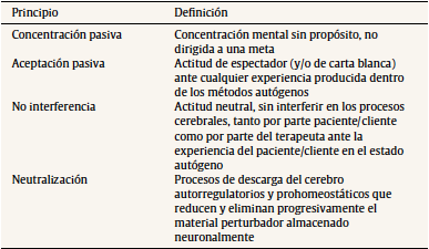 En los métodos autógenos, de acuerdo con Schultz y Luthe (1969), la tarea del practicante facilita los procesos autorreguladores a través de tres componentes: (1) el entrenamiento de un tipo de concentración mental, denominada concentración pasiva, que consiste en una focalización atencional en sensaciones propioceptivas, sin propósito o meta ulterior a la propia concentración, (2) una actitud mental denominada de aceptación pasiva, consistente en la adopción de una actitud de observación sin interferencia ante cualesquiera experiencias que surjan a lo largo del entrenamiento o método y (3) la práctica consistente y persistente de la concentración pasiva con una frecuencia de al menos tres veces al día, bien en la práctica de los ejercicios estándares del entrenamiento autógeno, bien en la práctica de procesos atencionales en cualquier método de la terapia autógena. En este sentido, es fundamental considerar que el entrenamiento autógeno, y por consiguiente la concentración pasiva, siempre están presentes en la aplicación de cualquier método autógeno (ver fig. 1). Igualmente característico de todos los métodos o técnicas autógenas es su carácter autogenerado, es decir, es el propio practicante el que induce el denominado estado autógeno que promueve los procesos autorreguladores, siendo las tareas del terapeuta de enseñanza, supervisión y facilitación de dichos procesos (tabla 2).