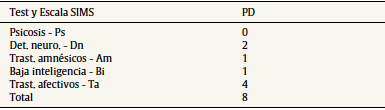 Los resultados en el SIMS descartan la sospecha de simulación. En todas las escalas se obtienen puntuaciones inferiores a la marcada por los autores para la sospecha de simulación. En el total de la escala obtiene una puntuación de 8, siendo la puntuación requerida para indicar sospecha de simulación > 16 (ver tabla 1).