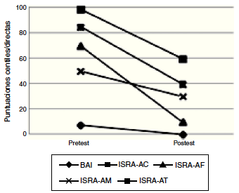 En el momento de finalizar el tratamiento había pasado un mes y medio desde que J.N. no experimentaba ninguna crisis de ansiedad. La mejoría clínica del paciente fue notable atendiendo a distintos criterios de valoración. Se aprecia una gran evolución desde que se enseñaron las técnicas de autocontrol emocional y control de pensamientos, habilidades que el paciente ha ido adquiriendo progresivamente para disminuir sus respuestas de ansiedad y control de la activación fisiológica, tanto en la situación laboral como en los espacios públicos. Es por ello por lo que no fue necesaria una intervención focalizada en la exposición a dichos lugares. J.N. fue capaz de gestionar su tiempo estableciendo límites y delegando responsabilidades, por lo que su sobrecarga laboral disminuyó. Se instauraron conductas de afrontamiento activo, disminuyendo así los pensamientos ansiógenos y por tanto el estrés laboral. Con respecto a las medidas de los autoinformes, las puntuaciones en las escalas de ansiedad descendieron notablemente en el postest. En la escala ISRA, la ansiedad total había disminuido de un centil 85 en el pretest a un centil 40 en el postest. Las puntuaciones en el BAI indican igualmente un descenso en la sintomatología física, descendiendo de 9 a 0 en puntuación directa. Los resultados aparecen gráficamente en la figura 2.