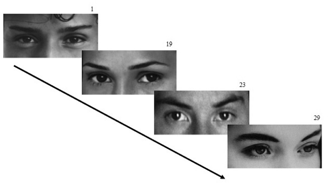 The Reading the Mind in the Eyes is a social sensitivity test (Baron-Cohen, Wheelwright, Hill et al., 2001; Baron-Cohen, Wheelwright, Spong, Scahill, & Lawson, 2001). Participants perceived 36 images of human faces expressing a complex mental state like thoughts, intentions, or emotions through facial expression. Each image was accompanied by four adjectives that described mental state. Participants were asked about the sexual identity of people in the pictures as a control perception task, in conjunction with the appropriate mental state (see Figure 1).