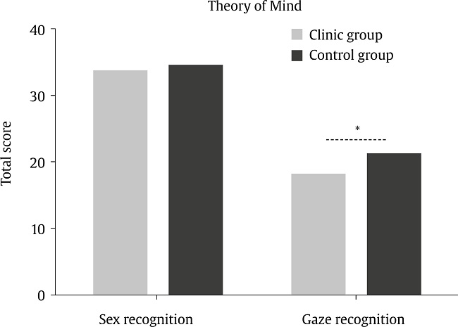 The theory of mind and decision-making are core cognitive processes in social cognition. The theory of mind appraisal does not find any difference for recognition of sexual identity (u = 76.000, p < .117) as a control measure of perception process. Gaze recognition of intentions, thoughts, and emotion display statistically significant differences between AN patients and healthy controls (u = 56.000, p < .018) (see Figure 3). The theory of mind is clearly reduced in the clinic group compared with healthy controls and could be related with less social interaction or empathy and more autistic characteristics. The absence of differences in sex recognition display a preserved perception process. More importantly, the mental state essay may show failures to understand others’ mind and will be and indirect measure of their own comprehension of mental states and emotions in these subjects.