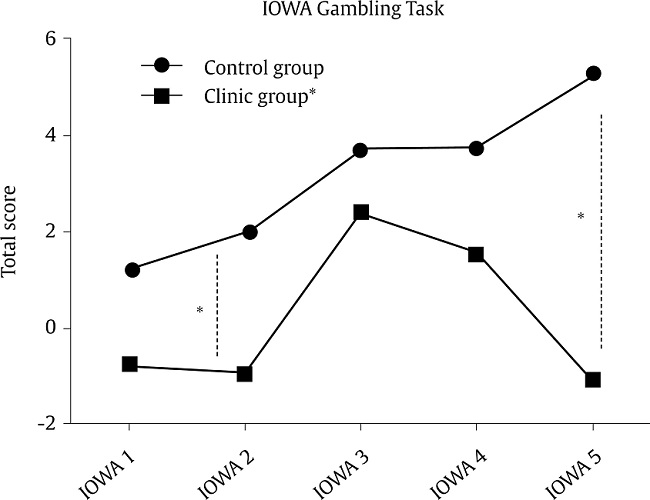 The decision-making essay was divided in five scores (Bechara, 2004): the first one, IOWA 1, obtained with the first 20 items, does not show discrepancy between groups (u = 78.000, p < .150); the second one, IOWA 2 (items 21-40), shows significant differences (u = 63.000, p < .038); IOWA 3 (items 41-60) and IOWA 4 (items 61-80) scores do not display any difference (u = 93.000, p < .411) and (u = 88.000, p < .304) between both groups respectively; the last score, IOWA 5 (items 81-100) exhibits statistically significant differences (u = 47.000, p < .006). Figure 4 displays an emotional-learning curve in this task with five scores. Healthy participants take more advantageous choices over time consistent with feedback across all elections. By contrast, participants with AN take some disadvantageous choices and their feedback does not show an “adaptive” effect on a better selection. Over time, patients are more impulsive, take risky elections, and will be related with poor clinic response.