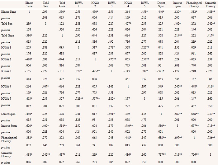 Table 2 displays the Spearman correlations. The duration of illness correlate negatively with gaze recognition (p ≤ .033), IOWA 2 (p ≤.006), IOWA 5 (p ≤ .012), and the executive function tasks, such as direct span (p ≤ .015), inverse span (p ≤ .000), phonological (p ≤ .037) and semantic (p ≤ .006) fluency. Other significant relations were not found. Nonetheless, gaze recognition of theory of mind showed positive correlates with inverse span (p ≤ .004) and semantic fluency (p ≤ .022) scores.