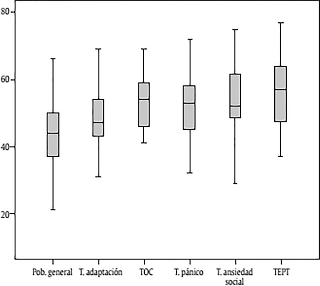 Las comparaciones post hoc utilizando el test de Dunnet mostraron que la puntuación media en el Inventario de Sugestionabilidad de la muestra control (M = 43.4, DT = 9.4) se diferenció significativamente del grupo de trastorno de ansiedad social (M = 53.5, DT = 10.9), con un tamaño del efecto grande (d = 0.99), del trastorno de pánico (M = 52.8, DT = 10.4) con un tamaño del efecto grande (d = 0.95), del trastorno obsesivo-compulsivo (M = 51.8, DT = 11.9), con un tamaño del efecto moderado (d = 0.78) y del trastorno de estrés postraumático (M = 56.7, DT = 11.0), con un tamaño del efecto grande (d = 1.31). Sin embargo, no se obtuvieron diferencias significativas entre la muestra control y el grupo de trastorno de adaptación en esta variable (M = 46.3, DT = 11.2). Las medias, desviaciones típicas en sugestionabilidad de cada uno de los grupos diagnósticos considerados pueden consultarse la Tabla 2 y Figura 1.