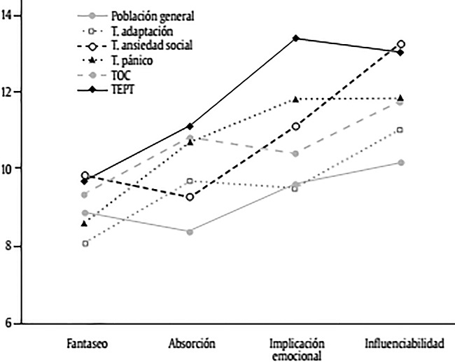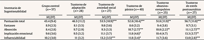 Con relación a las comparaciones en la puntuación total y en las escalas del IS entre la muestra control y los grupos diagnósticos considerados, los resultados del ANOVA entre-grupos mostraron un efecto significativo del tipo de grupo en la puntuación total en sugestionabilidad, F(5, 198) = 8.664, p < .001, η2p = .180, y en las escalas de absorción F(5, 198) = 5.897, p < .001, η2p = .130, implicación emocional, F(5, 198) = 4.459, p < .01, η2p = .101, e influenciabilidad F(5, 198) = 4.813, p < .001, η2p = .108, evaluadas mediante el IS.