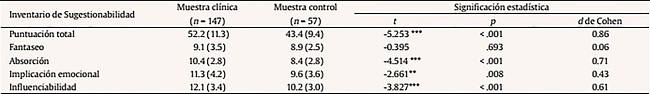 La Tabla 1 muestra la puntuación total en el Inventario de Sugestionabilidad y cada una de sus escalas de los participantes de la muestra clínica y la muestra control, así como la comparación estadística mediante pruebas t de Student para medidas independientes y el tamaño del efecto de las diferencias.