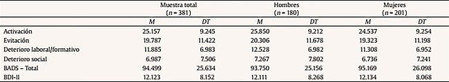 La Tabla 1 muestra los estadísticos descriptivos para la escala total y las subescalas de BADS y para el BDI-II, tanto para la muestra completa como para hombres y mujeres por separado. No se observaron diferencias estadísticamente significativas entre hombres y mujeres en ninguna de las medidas. La Tabla 2 muestra las correlaciones entre la escala total y las subescalas de BADS y el BDI-II (las correlaciones entre la escala total de BADS y cada una de las subescalas de BADS se obtuvieron después de eliminar cada subescala de la escala total). Los valores de correlación entre las subescalas BADS oscilaron entre .156 y .556 en valor absoluto. Estas correlaciones fueron estadísticamente significativas en un nivel de .0005, excepto entre activación y evitación (p < .01). Las correlaciones entre cada una de las subescalas BADS y la escala total oscilaron entre .282 y .627 en valor absoluto y todas fueron significativas en un nivel de .0005.
