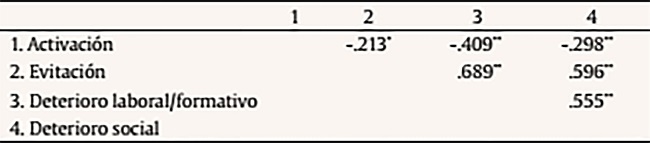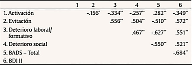 La consistencia interna de las medidas del BADS se estimó con el alfa de Cronbach (α). De acuerdo con los criterios normativos, la consistencia interna fue buena tanto para la escala total de BADS (α = .892) como para las subescalas de activación (α = .840), evitación (α = .847), deterioro laboral/formativo (α = .773) y deterioro social (α = .852).