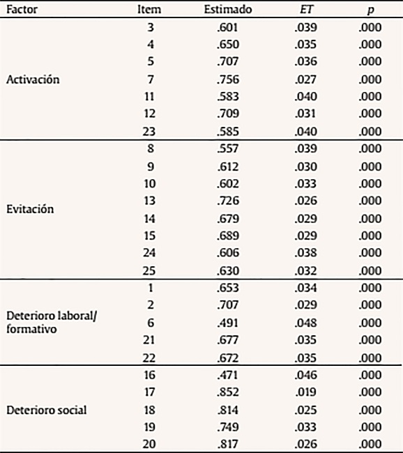 Validez estructural. Para replicar la estructura factorial original de BADS, se realizó un análisis factorial confirmatorio (AFC) utilizando Mplus 7.4 (Muthén y Muthén, 2015) con la estimación MLM. La bondad de ajuste del modelo se determinó mediante la escala χ2 de Satorra-Bentler (S-B χ2; Satorra & Bentler, 1994), el índice de ajuste comparativo (CFI; Bentler, 1990), el índice de Tucker-Lewis (TLI; Tucker y Lewis, 1973), el error de aproximación de la raíz media cuadrada (RMSEA; Steiger y Lind, 1980) y la raíz cuadrada media estandarizada residual (SRMR; Hooper, Coughlan, y Mullen, 2008). El ajuste del modelo se evaluó de acuerdo con los criterios recomendados por Schreiber, Nora, Stage, Barlow y King (2006): CFI ≥ .95, TLI ≥ .96, SRMR ≤ .08 y RMSEA < .06-.08. Los resultados de los índices de bondad de ajuste fueron mixtos, S-B χ2(269) = 679.576, p < .00005, CFI = .877, TLI = .862, SRMR = .070, RMSEA = .063 (CI .057-.069)]. Más concretamente, los valores de CFI y TLI mostraron un mal ajuste, mientras que los valores de SRMR y RMSEA indicaron un buen ajuste de los datos. Las Tablas 3 y 4 muestran los pesos factorials y las correlaciones entre los factores, respectivamente, de la solución completamente estandarizada del AFC. Todos los pesos factoriales fueron estadísticamente significativos en un nivel de .0005 y superiores a .40. Las correlaciones entre los factores oscilaron entre .213 y .689 en valor absoluto y fueron estadísticamente significativas en un nivel de .0005, excepto entre la activación y la evitación (p < .01).