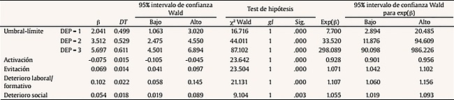 Los resultados del análisis de regresión logística ordinal se muestran en la Tabla 5. La estadística de Wald indicó que los coeficientes de regresión correspondientes a las subescalas BADS fueron todos significativamente diferentes de cero en el nivel de .0005, excepto que para el deterioro social (p < .01). Los signos de los coeficientes indicaron que valores bajos en activación, así como valores altos de evitación, deterioro laboral/formativo y deterioro social, incrementan las probabilidades de ser incluido en un nivel más alto de depresión (el efecto es constante independientemente de la categoría). Más específicamente, un aumento de una unidad en activación reduce las probabilidades pronosticadas de situarse en una categoría más alta de depresión (es decir, en la categoría severa en comparación con las categorías moderada, leve y mínima combinadas o, alternativamente, en la combinación de las categorías severa y moderada frente a las categorías leve y mínima combinadas o en las categorías severa, moderada y leve combinadas frente a la categoría mínima) en un 7.2%, manteniéndose las otras variables del modelo constantes. Por el contrario, un aumento de una unidad en evitación, deterioro laboral/formativo y deterioro social aumenta las probabilidades de ser incluido en una categoría más alta de depresión en un 7.1%, 10.7% y 5.5%, respectivamente, manteniendo las otras variables del modelo constantes.