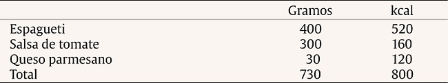 Alimento. Se ofreció a los participantes pasta de sémola de trigo (espagueti nº 5) con salsa de tomate y queso parmesano (Tabla 2). El peso neto de la porción para todos los participantes fue de 730 g (400 g de pasta cocida, 300 g de salsa, 30 g de queso parmesano).
