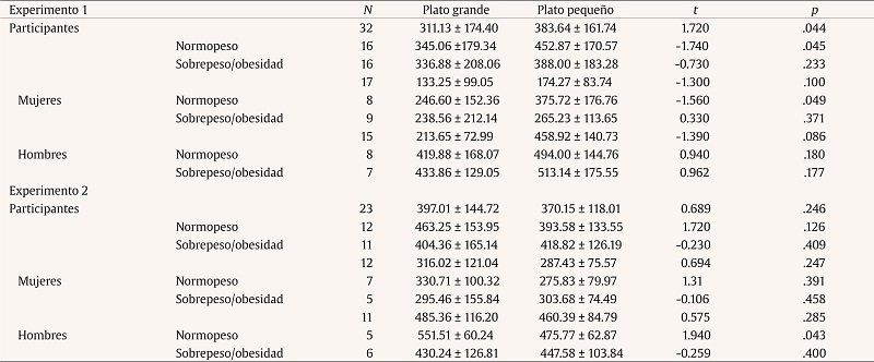 Respecto al segundo experimento, los registros de consumo de los participantes fueron analizados para encontrar diferencias en la condición de plato grande y plato pequeño. Los 22 participantes consumieron más calorías del plato grande que del pequeño pero la diferencia no fue significativa. Posteriormente se segmentaron los datos por IMC y por género. Tampoco se encontraron diferencias en la ingesta energética de pasta en las dos condiciones en los participantes con normopeso o con sobrepeso y obesidad. Sin embargo, al analizar los consumos por género e IMC, resultó que los hombres con normopeso consumieron significativamente más energía en la condición de plato grande en comparación al consumo registrado en la condición de plato pequeño. De hecho, los hombres con normopeso mostraron la ingesta energética más alta registrada durante el experimento en las dos condiciones, al consumir el 82% de la porción disponible en la condición de plato grande y 71% de la porción en la condición de plato pequeño. Por su parte, las mujeres no mostraron diferencias en el consumo energético de pasta en las dos condiciones. Tampoco se encontraron diferencias significativas al segmentar los datos de mujeres por IMC.