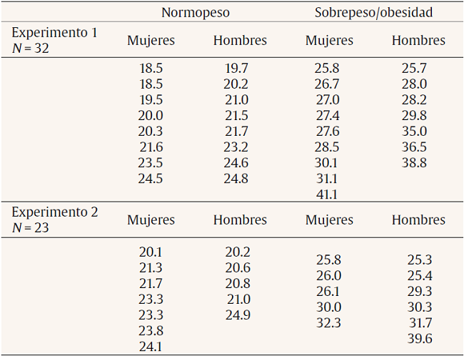 Se reclutaron 55 participantes, 29 mujeres y 26 hombres de entre 18 y 26 años de edad. Los participantes cumplieron con los siguientes criterios: que les gustara el alimento que se ofreció en las sesiones experimentales, no se encontraran bajo una dieta para ganar o perder peso, no llevaran a cabo un entrenamiento atlético, no consumieran medicamentos que afectaran el apetito o la ingesta de alimento, no fumaran, no presentaran alergia al alimento ofrecido y en el caso de las mujeres no estar embarazadas o lactando. Se eliminaron los datos de aquellos participantes que no completaron las sesiones experimentales. Se asignaron 32 participantes al primer experimento y 23 al segundo a partir de su IMC (Tabla 1). Todos los procedimientos llevados a cabo en el estudio fueron de acuerdo a los principios éticos de los psicólogos y el código de conducta establecidos por la American Psychological Association. Todos los participantes firmaron una carta de consentimiento informado.