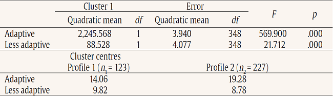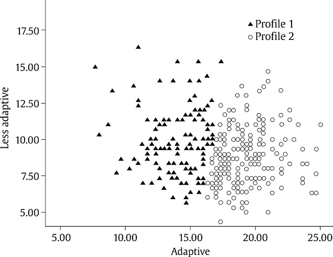 Figure 1 shows the differential distribution of the two groups according to their mean scores in the adaptive and less adaptive strategies of the CERQ-S. A more detailed analysis of these strategies suggests that, although there is a more homogeneous distribution regarding the use of less adaptive strategies in both groups, the participants in Group 1 (Profile 1) tends to be located in the left part of the graph, scoring lower on the adaptive strategies than Group 2 participants. In contrast, those in Group 2 (Profile 2) tend to be located on the right (greater use of adaptive strategies). The last profile faces the adverse events with a wider range of coping strategies than Profile 1. Profile 2 tends to use more frequently the putative labelled adaptive strategies.