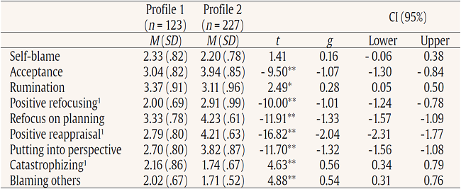 Statistically significant differences were found between the two groups in eight of the nine first-order dimensions of the CERQ-S (the exception being self-blame): participants in Profile 1 scored significantly higher in the strategies rumination, catastrophizing, and blaming others, with effect sizes ranging from small to moderate. On the other hand, those in Profile 2 obtained higher mean scores in the use of the five adaptive strategies of the CERQ-S – acceptance, positive refocusing, refocus on planning, positive reappraisal, and putting into perspective – with effect sizes ranging between large and very large. Table 2 shows the mean values obtained by each group in the nine cognitive emotion regulation strategies.